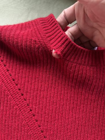 ニットの襟がほつれて広がっちゃった…かけつぎで自然に修復!Before/Afterで修理のビフォーアフターをご覧ください。